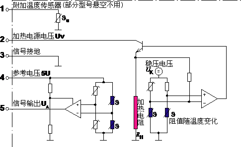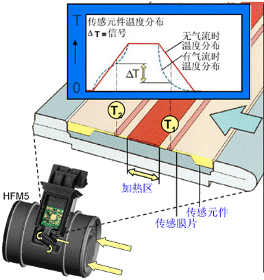 熱膜式空氣流量計是一個(gè)帶有邏輯輸出的空氣質(zhì)量傳感器,為了獲得空氣流量,傳感器元件上的傳感器膜片被中間安裝的加熱電阻加熱,膜片上的溫度分配被與加熱電阻平行安裝的溫度電阻測量。通過(guò)傳感器的氣流改變了膜片上的溫度分配,從而使得兩個(gè)溫度電阻的電阻值產(chǎn)生差異。電阻值的差異取決于氣流的方向和流量,因此空氣流量傳感器對空氣的流量和方向具有較高的要求。微機械制造的傳感器元件的小尺寸和較低的熱容量式的傳感器的響應時(shí)間<15ms。如需要可以在傳感器內部安裝進(jìn)氣溫度傳感器,用以測量進(jìn)氣溫度。