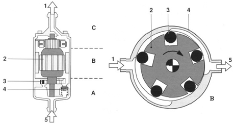 A圖 A 油泵元件 B 電動(dòng)機 C 后蓋 1-壓力端 2-電動(dòng)機樞軸 3-滾子泵 4-限壓閥 5-進(jìn)油端