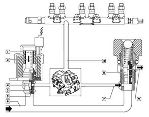 1. 進(jìn)油計量比例閥控制線(xiàn)圈  2. 閥芯  3. 復位彈簧   4. 柱塞閥  5. 進(jìn)油計量比例閥燃油出口6. 高壓油泵的進(jìn)油口(經(jīng)過(guò)濾清器過(guò)濾后的燃油)7. 高壓油泵的回油油道  8. 階躍回油閥的柱塞  9. 回油 10. 高壓燃油