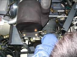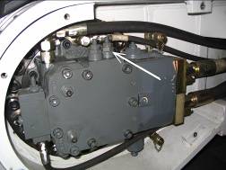 按下控制屏上“F3”鍵,和“兔子開(kāi)關(guān)”按鈕,快速收回斗桿,讀出回油壓力,應為110 bar,如果不對,就調斗桿油缸上的節流閥,使之達到目的100 bar