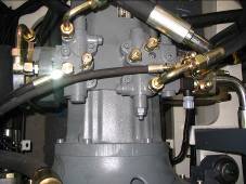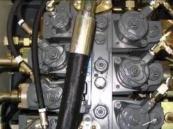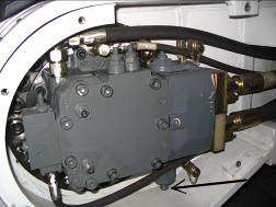 按下控制屏上“F3”鍵,快速回收鏟斗,讀出回油壓力,應為90--100 bar,如果達不到,就調工作閥塊第二個(gè)黑六角螺釘,如下圖。