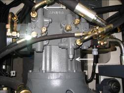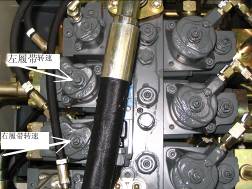 斷開(kāi)回轉馬達制動(dòng)油口,如下圖。在斷開(kāi)的油管上接一測口,在斷開(kāi)的馬達接頭處接堵頭。
