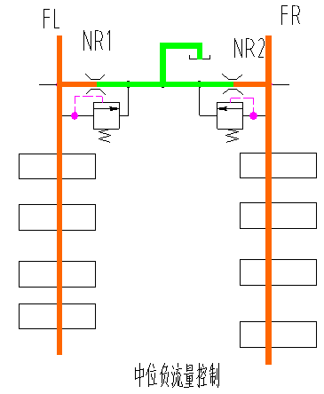 當閥處于中位時(shí),P1,P2通過(guò)閥的中位油道,最后經(jīng)過(guò)NR1,NR2節流后回油箱,在節流口NR1,NR2前取得壓力信號FL,FR,就可以控制主泵到最小排量。