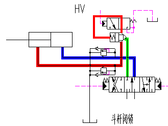 1.2.6斗桿、動(dòng)臂閉鎖,為防止斗桿下掉,閥組內裝有斗桿閉鎖閥,它由控制閥HV和錐閥構成,其原理如下圖: