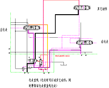 1.2.3行走直線(xiàn)功能,當挖掘機陷入坑中或其它特殊工況時(shí),要求挖掘機能邊行走邊動(dòng)工作裝置(動(dòng)臂、斗桿、鏟斗、回轉),能實(shí)現挖掘機的自救或其它功能,其工作原理如下: