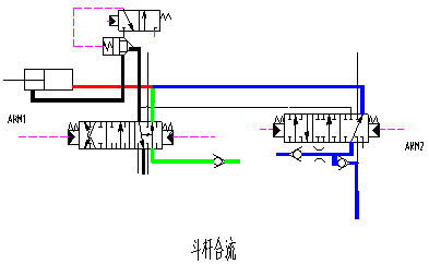 斗桿合流是通過(guò)ARM2閥把泵2的流量引到斗桿大腔或小腔,實(shí)現合流。