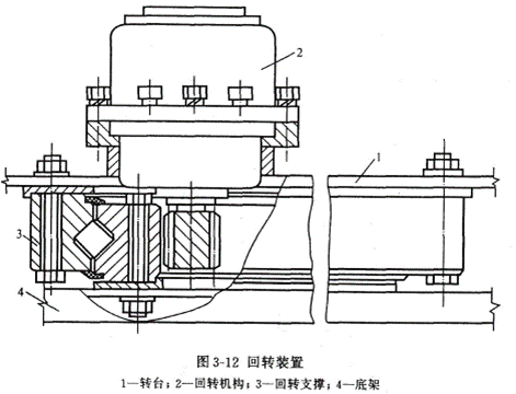 回轉機構使工作裝置及上部轉臺向左或向右回轉,以便進(jìn)行挖掘和卸料。單斗液壓挖掘機的回轉裝置必須能把轉臺支撐在機架上,不能傾斜并使回轉輕便靈活。為此,單斗液壓挖掘機都設有回轉支撐裝置(起支撐作用)和回轉傳動(dòng)裝置(驅動(dòng)轉臺回轉),它們被統稱(chēng)為回轉裝置,見(jiàn)圖3-12。