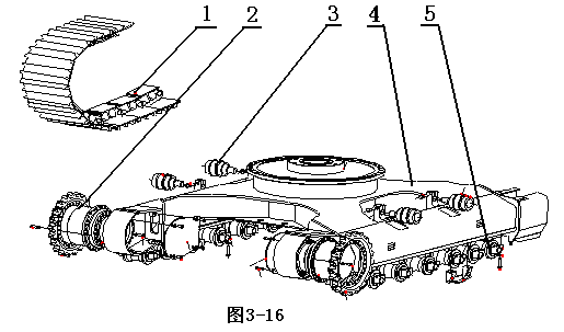 1-履帶;2-行走馬達及驅動(dòng)輪;3-托鏈輪;4-X型車(chē)架;支重輪
