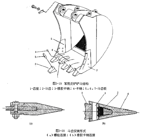 反鏟用的鏟斗形狀、尺寸與其作業(yè)對象有很大關(guān)系。為了滿(mǎn)足各種挖掘作業(yè)的需要,在同一臺挖掘機上可配以多種結構型式的鏟斗,見(jiàn)圖3-19、圖3-20分別為反鏟用鏟斗的基本形式和常用形式。鏟斗的斗齒采用裝配式,其形式有橡膠卡銷(xiāo)式和螺栓連接式,如圖2-5所示。