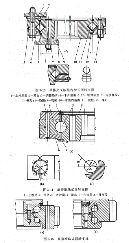 單斗液壓挖掘機用回轉支撐的結構型式,實(shí)現上部平臺的回轉,回轉支撐按結構形式分為轉柱式和滾動(dòng)軸承式等兩種,見(jiàn)圖3-13、圖3-14、圖3-15。