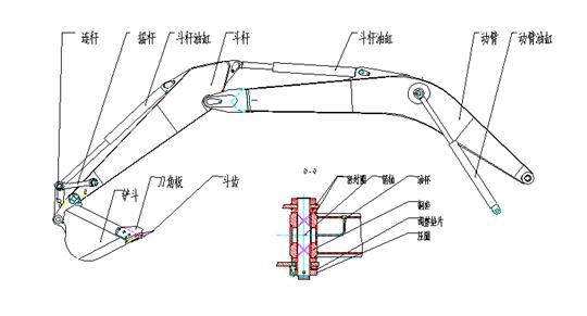 整體式動(dòng)臂的優(yōu)點(diǎn)是結構簡(jiǎn)單,質(zhì)量輕而剛度大。其缺點(diǎn)是更換的工作裝置少,通用性較差。多用于長(cháng)期作業(yè)條件相似的挖掘機上。整體式動(dòng)臂又可分為直動(dòng)臂和彎動(dòng)臂兩種。其中的直動(dòng)臂結構簡(jiǎn)單、質(zhì)量輕、制造方便,主要用于懸掛式液壓挖掘機,但它不能使挖掘機獲得較大的挖掘深度,不適用于通用挖掘機;彎動(dòng)臂是目前應用最廣泛的結構型式,與同長(cháng)度的直動(dòng)臂相比,可以使挖掘機有較大的挖掘深度,但降低了卸土高度,這正符合挖掘機反鏟作業(yè)的要求。