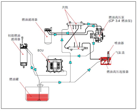 燃油在壓力下貯存到共軌噴油器中以備噴射。噴射燃油的數量由駕駛員確定,噴射