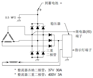 � 交流發(fā)電機裝有整體式硅整流器。一個(gè)裝在交流發(fā)電機內部的晶體管穩壓器,限