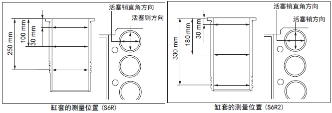 2.5 測量三菱發(fā)動(dòng)機缸套的內徑選擇缸套內側的上部( 上死點(diǎn)時(shí)No.1 氣環(huán)的位置)、中間部分和O形圈插入部分,沿活塞銷(xiāo)方向及其直角方向,測量缸套的內徑。超過(guò)極限值時(shí)更換新的缸套。發(fā)生變形時(shí)重新安裝。