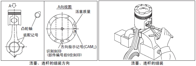 (1) 活塞銷(xiāo)涂抹潤滑油后插入,將活塞和連桿組裝在一起?;钊瓦B桿的組裝方向如圖所示。