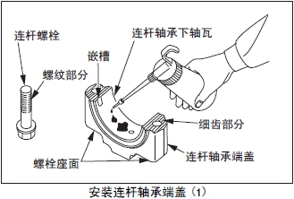 (c) 安裝連桿軸承端蓋時(shí),細齒形部分、螺栓座面或螺栓的螺紋部分不能有雜質(zhì)或金屬片夾入。