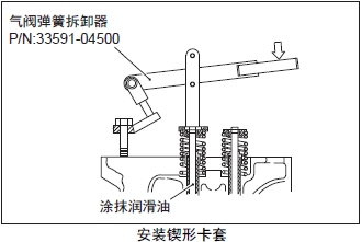 (5) 在氣閥導管上安裝彈簧座、氣閥彈簧和轉動(dòng)端蓋,用氣閥彈簧拆卸器安裝氣閥的鍥形卡套。