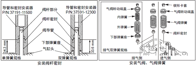 注: 雙彈簧規格時(shí),進(jìn)氣側和排氣側的零件構成不同,注意不要裝錯。