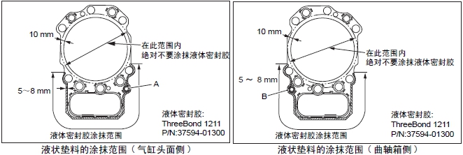 (2) 在氣缸頭墊片兩面的套筒孔和潤滑油通路周?chē)”⊥磕ㄒ籂顗|料。液狀墊料的涂抹范圍,在氣缸頭墊片外周的5 ~ 8 mm,厚度0.2 ~ 0.5 mm。詳細涂抹范圍參考右圖。