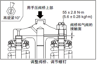 (3) 在搖臂和橋帽之間插入厚薄規測量間隙的同時(shí),調整調節螺釘至厚薄規感覺(jué)稍緊但可拉動(dòng)的程度。