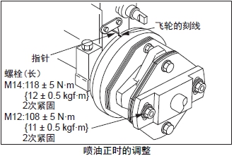 (4) 再次緩慢地正向盤(pán)車(chē),使減振器上的規定噴油正時(shí)刻線(xiàn)和發(fā)動(dòng)機的指針一致。這時(shí),確認燃油噴油泵飛輪的記號「0」刻線(xiàn)和指針一致。不一致時(shí),反復實(shí)施(2) 項。