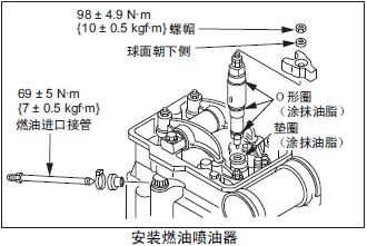 (3) 墊圈上涂抹少量油脂,安裝在燃油噴油器本體上。