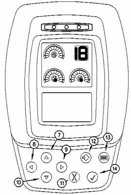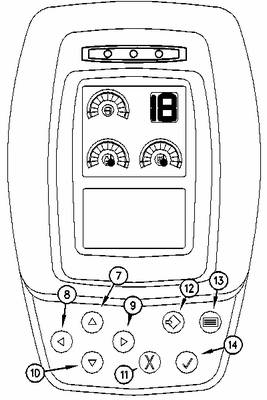 卡特彼勒312C, 315C, 318C, 319C, 320C, 321C, 322C, 325C, 330C 和 M325C 挖掘機監視器面板 (7) "向上"鍵 (8) "向左"鍵 (9) "向右"鍵 (10) "向下"鍵 (11) "取消"鍵 (12) "設定"鍵 (13) "菜單"鍵 (14) "OK" 鍵 |