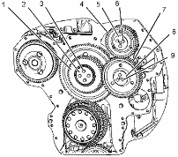 將齒輪組組件 (1) 安置在樞軸上。確保對準塔齒輪組件與曲軸齒輪上的正時(shí)標記。
