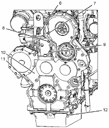 檢查凸輪軸齒輪與可調節惰輪齒輪組件之間的齒隙。 此齒隙應為 0.356 ± 0.254 mm (0.014 ± 0.010 in)。 參考測試和調整, "齒輪總成(前)- 正時(shí)",以了解齒隙調整步驟。擰緊螺母 (12) 和螺栓至扭矩為 55 ± 10 N·m (41 ± 7 lb ft)。
