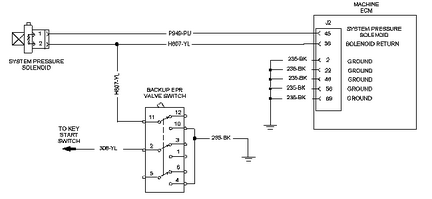 該診斷代碼與系統壓力電磁閥有關(guān)。 FMI 06 意味著(zhù) ECM 已檢測到電路中存在對接地短路。