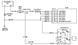 當鑰匙開(kāi)關(guān)處于接通位置或起動(dòng)位置時(shí),ECM 通過(guò) P1-70 接收鑰匙開(kāi)關(guān)的輸入。 當 ECM 檢測到此輸入處有蓄電池電壓時(shí),ECM 就會(huì )通電啟動(dòng)。 當斷開(kāi)此輸入的蓄電池電壓時(shí),ECM 就會(huì )斷電停機。