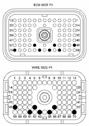 ECM 通過(guò) ECM 的 15 安培保險絲持續接收蓄電池電壓。 無(wú)開(kāi)關(guān)蓄電池電壓通過(guò) P1-48 、P1-52 和 P1-53 供至 ECM。 蓄電池負極通過(guò) P1-61、P1-63 和 P1-65 供至 ECM。