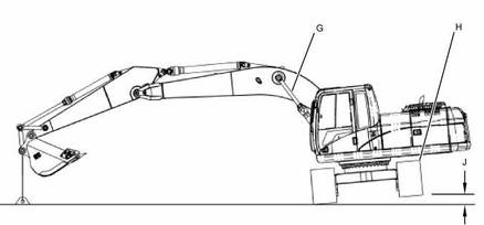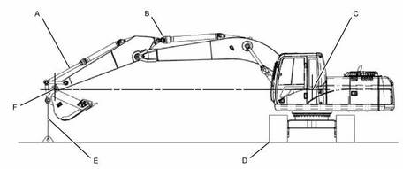 安放機器。參考圖1。 關(guān)閉發(fā)動(dòng)機。 使用適當的起吊設備(E)將連桿機構與靜止物體相連。確保連桿鼻端中的銷(xiāo)與動(dòng)臂座架(F)的銷(xiāo)距地面的距離相同。