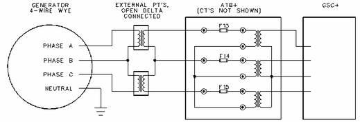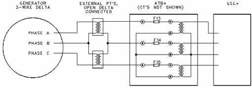 在四線(xiàn) Y 形發(fā)電機上,除非完全持續的平衡掉負載,需要三個(gè)獨立的電壓互感器(PT's)來(lái)提高功率表的精度。 即使負載已經(jīng)平衡,仍然不能確定一些 功率參數 GSC+顯示屏上沒(méi)有顯示這些參數:有效功率相位 A、B、C 和功率因數相位 A、B、C ATB+包括三個(gè)電壓互感器,以適應4 線(xiàn) Y 形發(fā)電機。 當 4 線(xiàn) Y 形發(fā)電機組使用一個(gè)開(kāi)放三角形 PT 配置時(shí),沒(méi)有利用ATB+的全部性能。