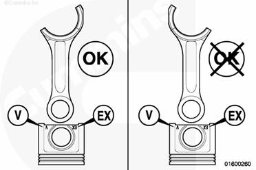 由于氣門(mén)套位于活塞頂部,QSK78鍛造鑄鐵(FCD)活塞必須以特定的方向安裝?!癊X”標記位于連桿柄的長(cháng)側,而“V”標記位于連桿柄的短側。
