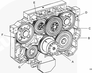 康明斯QSK78在左排的凸輪軸惰輪和燃油泵驅動(dòng)惰輪的位置采用加寬的正齒輪和復合齒輪。齒牙的直徑節距加大,以適應扭矩的增加。QSK78采用兩件分離式曲軸齒輪,左排的凸輪軸驅動(dòng)復合齒輪由6顆螺栓固定。