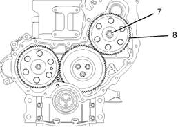 2.松開(kāi)鎖緊螺釘(5)。轉動(dòng)隔套(6),以便將鎖緊螺釘(5)擰緊抵到噴油泵的軸上。逆時(shí)針?lè )较蜣D動(dòng)噴油泵齒輪來(lái)消除齒隙。將鎖緊螺釘(5)擰緊至扭矩17N·m(13lbft)。