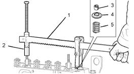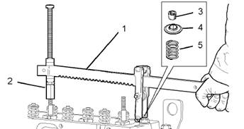 3.將氣門(mén)彈簧壓縮器(1)在缸蓋上安裝入位,以壓縮相關(guān)氣門(mén)彈簧(5)。壓縮氣門(mén)彈簧(5)。