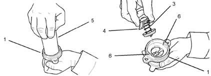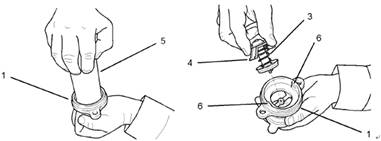 4.將27610226節溫器工具(5)安裝到水溫調節器殼體(1)中。推壓工具(5)以擠壓擋圈(4)。旋轉工具(5)以將水溫調節器(3)從水溫調節器殼體(1)的凸舌片(6)上分離。從水溫調節器殼體(1)上拆卸工具(5)。從水溫調節器殼體(1)上拆下水溫調節器(3)。