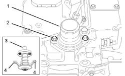 6.安裝將水溫調節器殼體(1)固定到缸蓋上的調整螺釘(2)。將調整螺釘(2)擰緊至扭矩為44N·m(32lbft)。