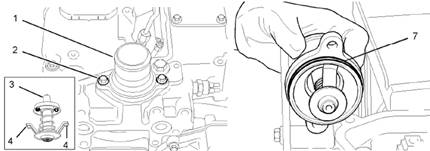 3.拆下將水溫調節器殼體(1)在缸蓋上固定到位的調整螺釘(2)。卸下水溫調節器殼體(1)。拆下水溫調節器殼體(1)的O形圈。棄置O形圈。