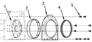 6.使用十個(gè)調整螺釘(5),將曲軸后部密封(3)組件固定到缸體上,不用擰緊。