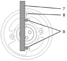 4.用頂部的“T”標記(8)對準皮帶輪,并且與發(fā)動(dòng)機的中心線(xiàn)成一直線(xiàn),然后在曲軸上安裝皮帶輪。使用一個(gè)合適的直尺(7)靠在導向銷(xiāo)(9)上,以協(xié)助皮帶輪的校準。