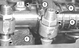 3.松開(kāi)各個(gè)搖臂(2)上的螺母(8)和調整螺釘(9)。這有助于避免在搖臂軸安裝過(guò)程中氣門(mén)彎曲或推桿彎曲。