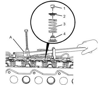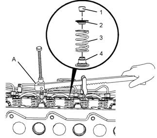 4.將工具(A)安裝在缸蓋的相應位置中,以壓縮氣門(mén)彈簧(3)。