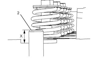 5檢查氣門(mén)導管(2)的凸出(X)。氣門(mén)導管應比氣門(mén)彈簧凹槽高出12.7mm(0.500in)。有關(guān)更多資料,請參閱《技術(shù)規格》,“缸蓋氣門(mén)”。