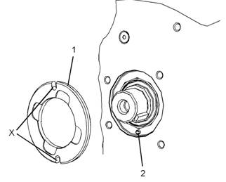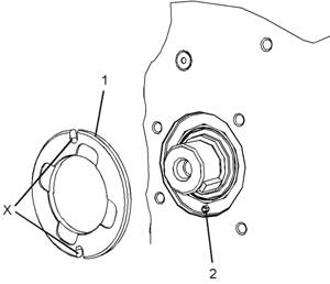 7用清潔的發(fā)動(dòng)機機油潤滑止推墊圈。對齊止推墊圈(1)中的槽(X)與缸體中的定位銷(xiāo)(2)。將止推墊圈(1)安裝到缸體的凹槽中。