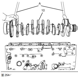 7將工具(A)和適當的起吊設備連接到曲軸(10)上。將曲軸(10)吊入缸體。曲軸的重量約為61kg(134lb)。