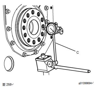 15.檢查曲軸的軸向間隙。向發(fā)動(dòng)機前部推動(dòng)曲軸。將工具(C)安裝到缸體及曲軸后表面上。向發(fā)動(dòng)機后部推動(dòng)曲軸。使用工具(C)測量曲軸軸向間隙。曲軸允許的軸向間隙為0.10mm(0.004in)至0.41mm(0.016in)。