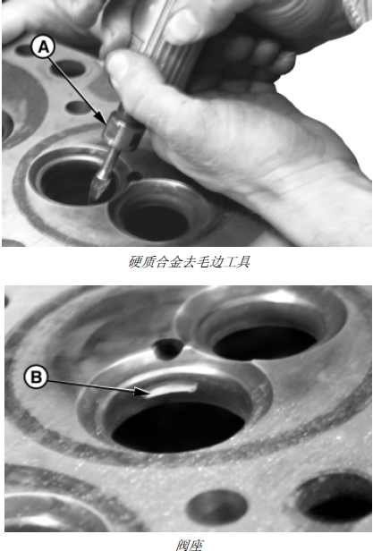 1. 用硬質(zhì)合金去毛邊工具 (A) 提起閥門(mén)座鑲圈底部的毛邊 (B)。